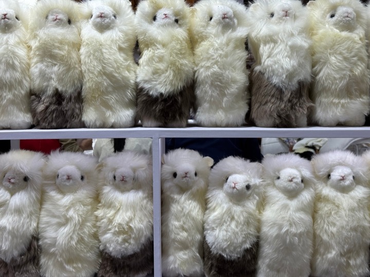 一排排毛茸茸的羊驼公仔整齐陈列。