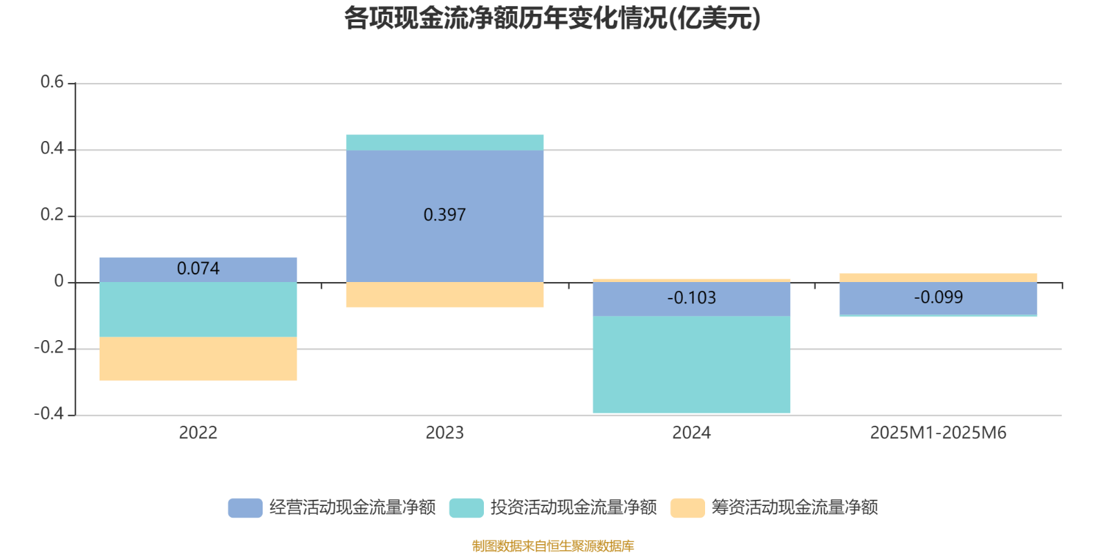 2025年1月至6月,公司经营活动现金流净额为-989.87万美元,同比增加523.86万美元;筹资活动现金流净额260.65万美元,同比增加650.22万美元;投资活动现金流净额-54.65万美元,上年同期为-1987.85万美元。