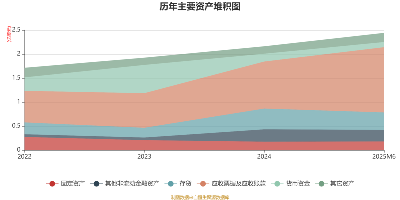 资产重大变化方面,截至2025年6月,公司应收票据及应收账款较上期末增加38.78%,占公司总资产比重上升10.39个百分点;存货较上期末减少15.99%,占公司总资产比重下降5.13个百分点;货币资金较上期末减少34.26%,占公司总资产比重下降3.14个百分点;其他非流动金融资产较上期末减少6.36%,占公司总资产比重下降2.03个百分点。