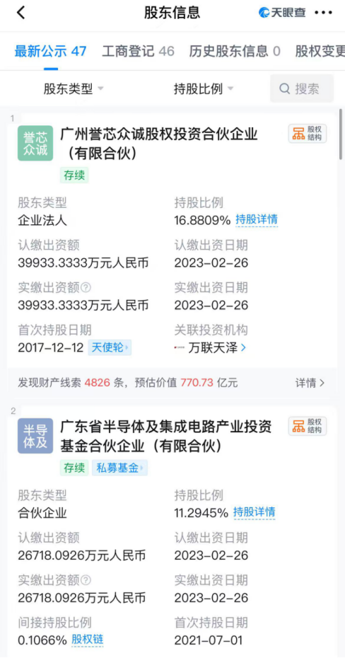 天眼查信息显示,粤芯半导体主要股东包括誉芯众诚、广东半导体基金、广州华盈、科学城集团、国投创业基金、合肥华登等投资机构。