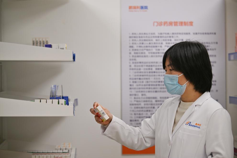 2025年2月26日,医护人员在天津鹏瑞利医院门诊药房查看药品。新华社记者李然摄