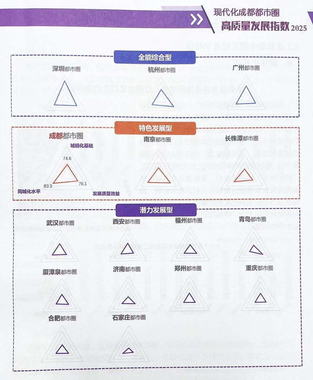 第二类为特色发展型都市圈,整体发展态势稳健,在重点领域形成鲜明竞争优势,包括成都、南京、长株潭都市圈。其中,成都都市圈在同城化发展维度展现出强劲实力。