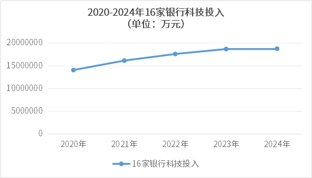 以银行为例,企业预警通数据显示,披露数据的16家国有行及股份行的科技投入,从2020年的1404亿元增长至2024年的1874亿元,但增速明显放缓。单从头部银行的数据来看,这一趋势更加明显。记者梳理的数据显示,从2023年起部分银行的科技投入金额已经开始减少,2024年记者梳理的13家全国性银行中,仅有光大银行一家实现科技投入的双位数增长。