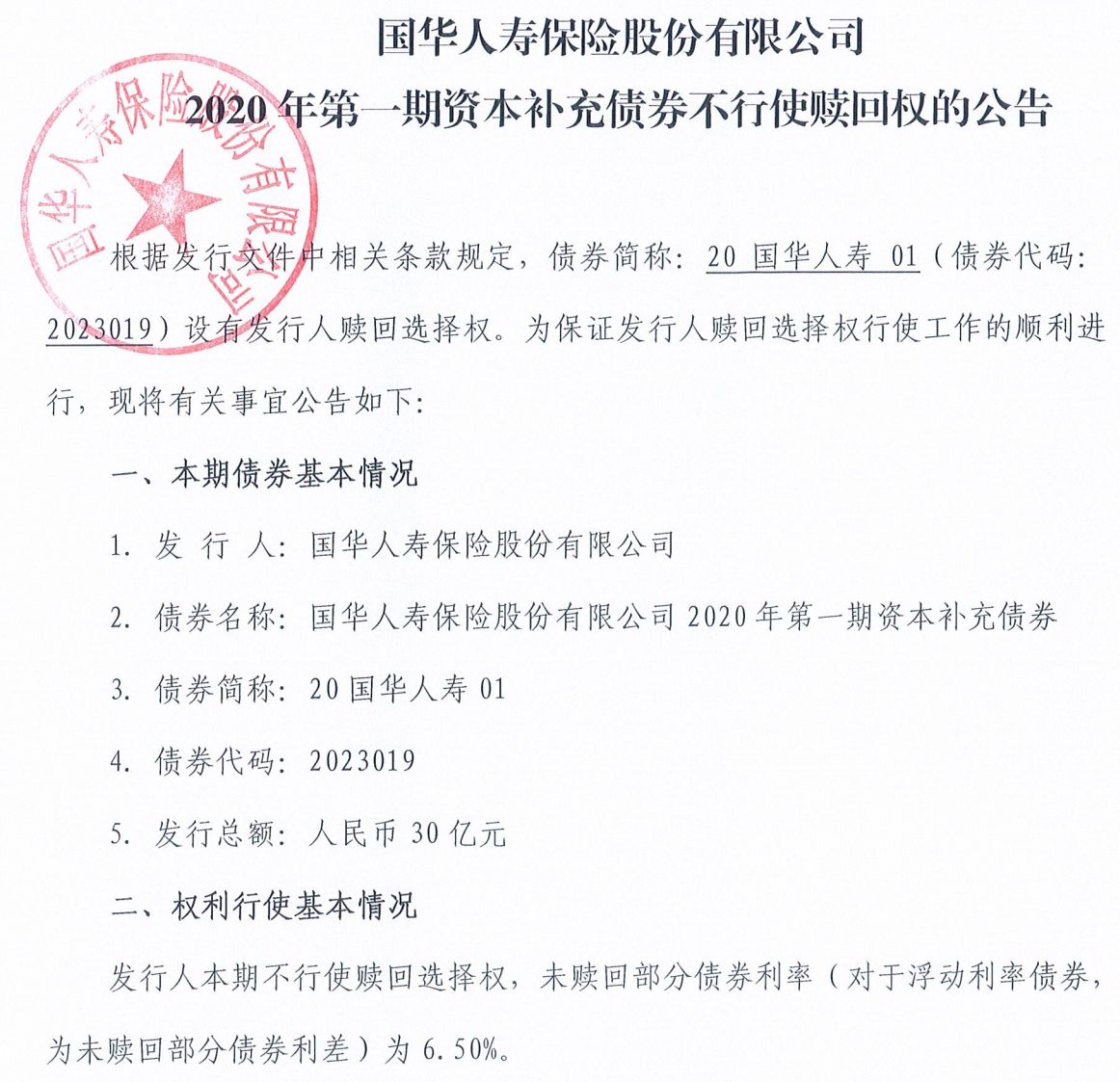 如果发行人不行使赎回权,则从第六个计息年度开始票面利率加100个基点。根据该公司近期公告,发行人不行使赎回“20国华人寿01”债券的选择权,未赎回部分债券利率为6.5%。