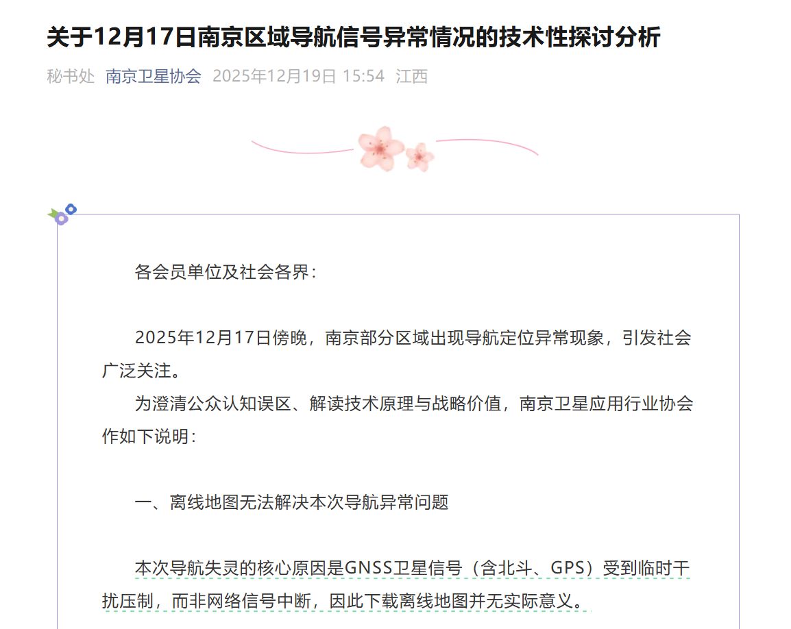12月19日,“南京卫星协会”微信公众号发布《关于12月17日南京区域导航信号异常情况的技术性探讨分析》。