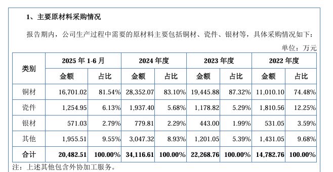 赛英电子的铜材重要供应商之一为金田股份(SH601609)。在报告期内,赛英电子对金田股份的采购金额占各期总采购额的比例分别为13.85%、48.42%、47.28%和42.53%。金田股份在2022年为赛英电子的第三大供应商,在2023年至2025年上半年均为赛英电子的第一大供应商。
