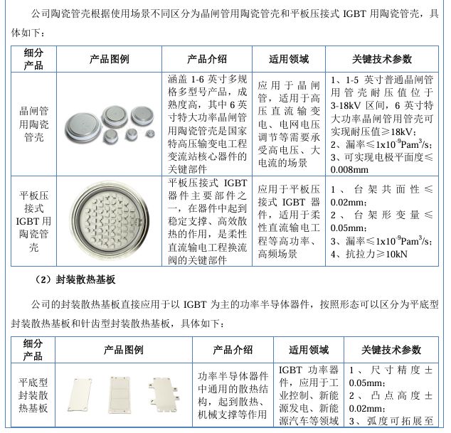 赛英电子主要从事陶瓷管壳和封装散热基板等功率半导体器件关键部件的研发、制造和销售,其主要产品可分为陶瓷管壳、封装散热基板两大类,主要应用于晶闸管、IGBT(绝缘栅双极晶体管)和IGCT(集成门极换流晶闸管)等功率半导体器件,应用领域覆盖包括发电、输电、变电、配电、用电等环节在内的电力系统全产业链。