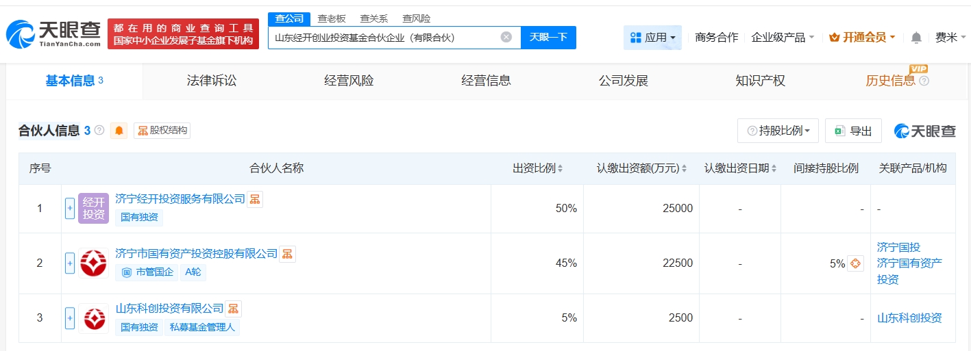 每经AI快讯,天眼查App显示,近日,山东经开创业投资基金合伙企业(有限合伙)成立,执行事务合伙人为山东科创投资有限公司,出资额5亿元人民币,经营范围为以私募基金从事股权投资、投资管理、资产管理等活动,创业投资,以自有资金从事投资活动,由济宁经开投资服务有限公司、济宁市国有资产投资控股有限公司、山东科创投资有限公司共同出资。