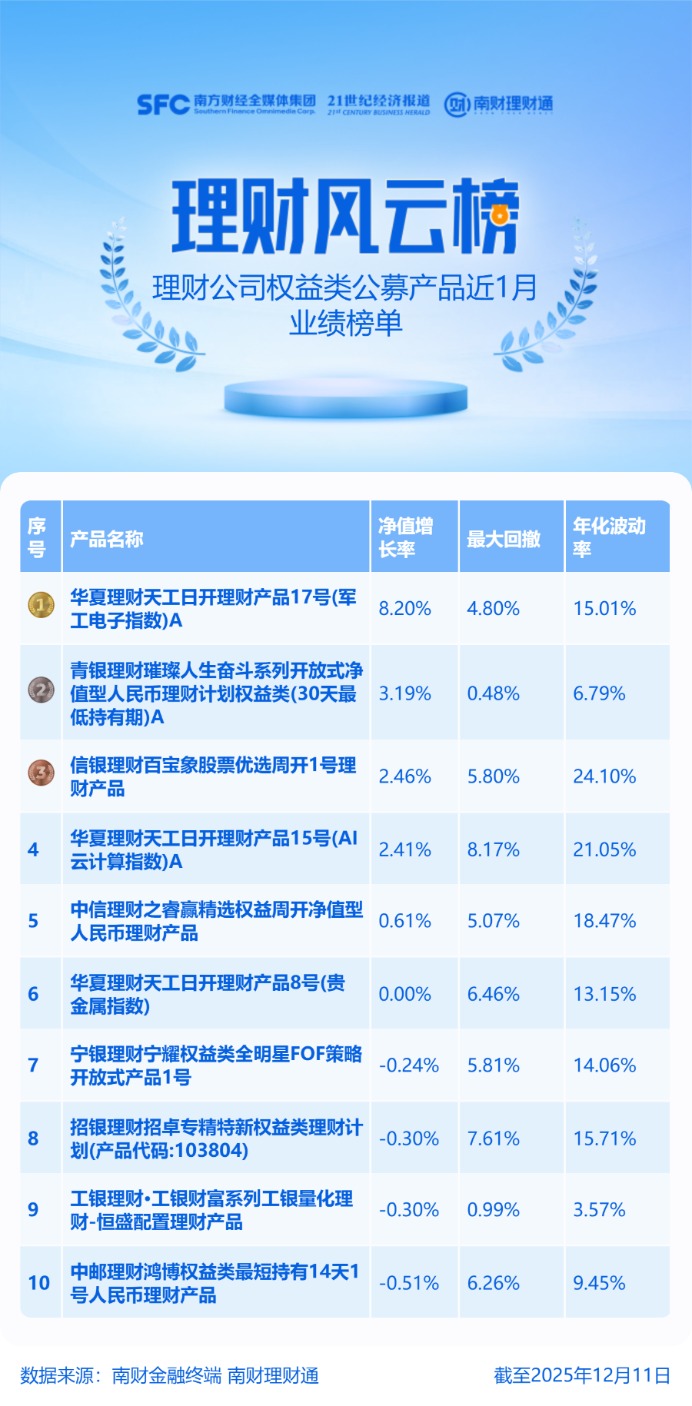 产品统计范围为理财公司权益类理财公募产品,统计截止日期为2025年12月11日,统计区间为近1个月。