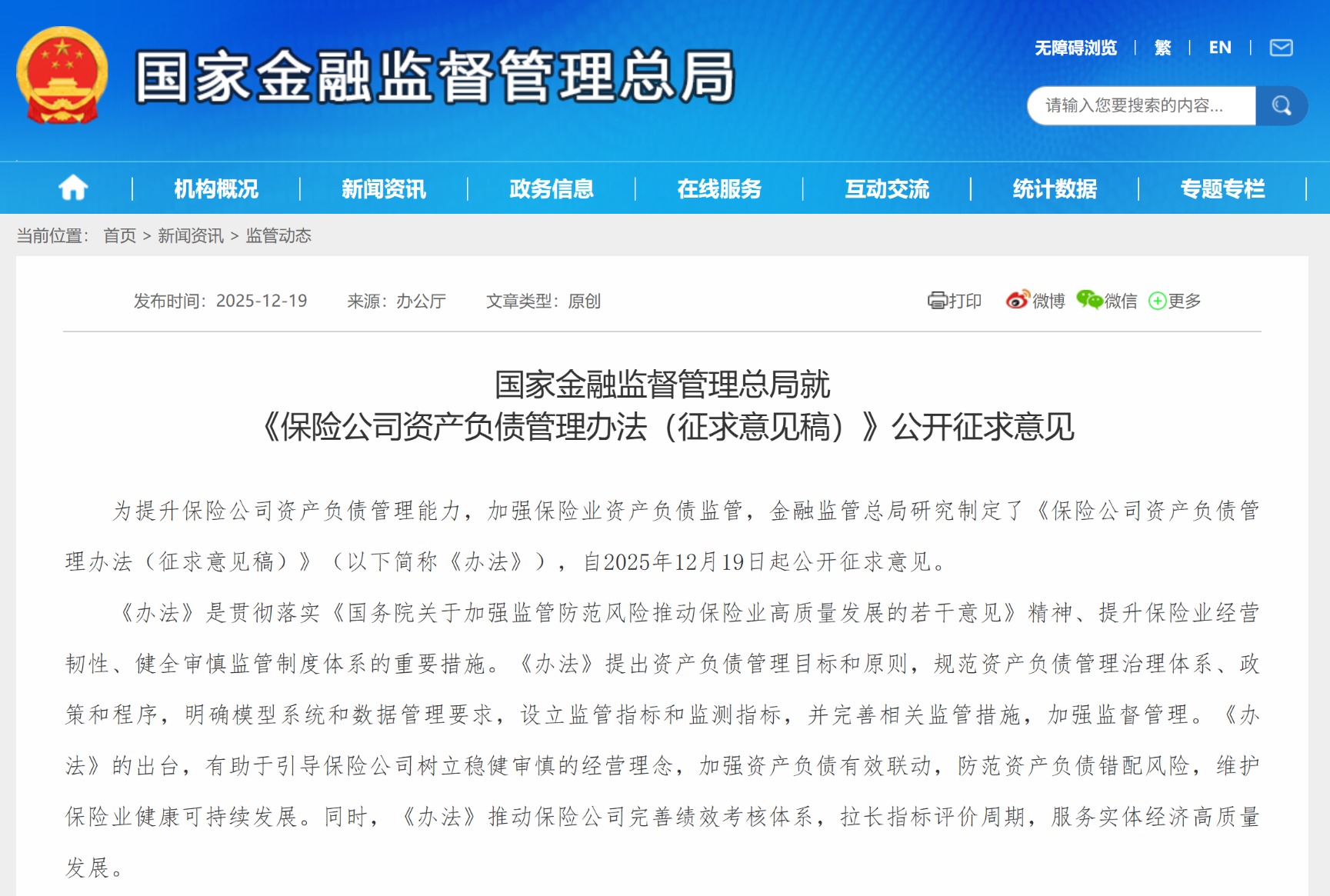 12月19日,为提升保险公司资产负债管理能力,加强保险业资产负债监管,金融监管总局就《保险公司资产负债管理办法(征求意见稿)》(下称《办法》)公开征求意见。