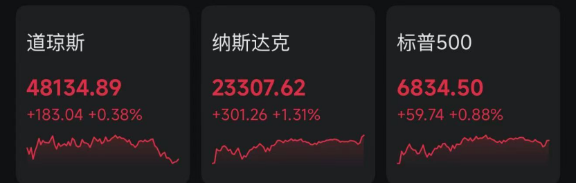 在科技股反弹带动下,美股三大指数周五集体收涨。截至收盘,道指涨0.38%,报48134.89点;纳指涨1.31%,报23307.62点;标普500指数涨0.88%,报6834.50点。纳斯达克中国金龙指数收涨0.86%,热门中概股多数上涨,小鹏汽车涨超6%,理想汽车涨超5%。