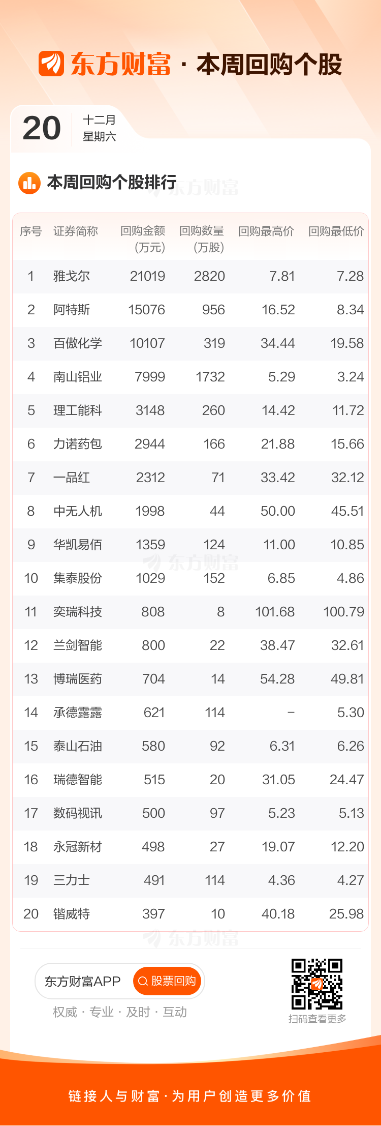 本周雅戈尔披露的回购金额最高,为2.10亿元,阿特斯排名第二,为1.51亿元。