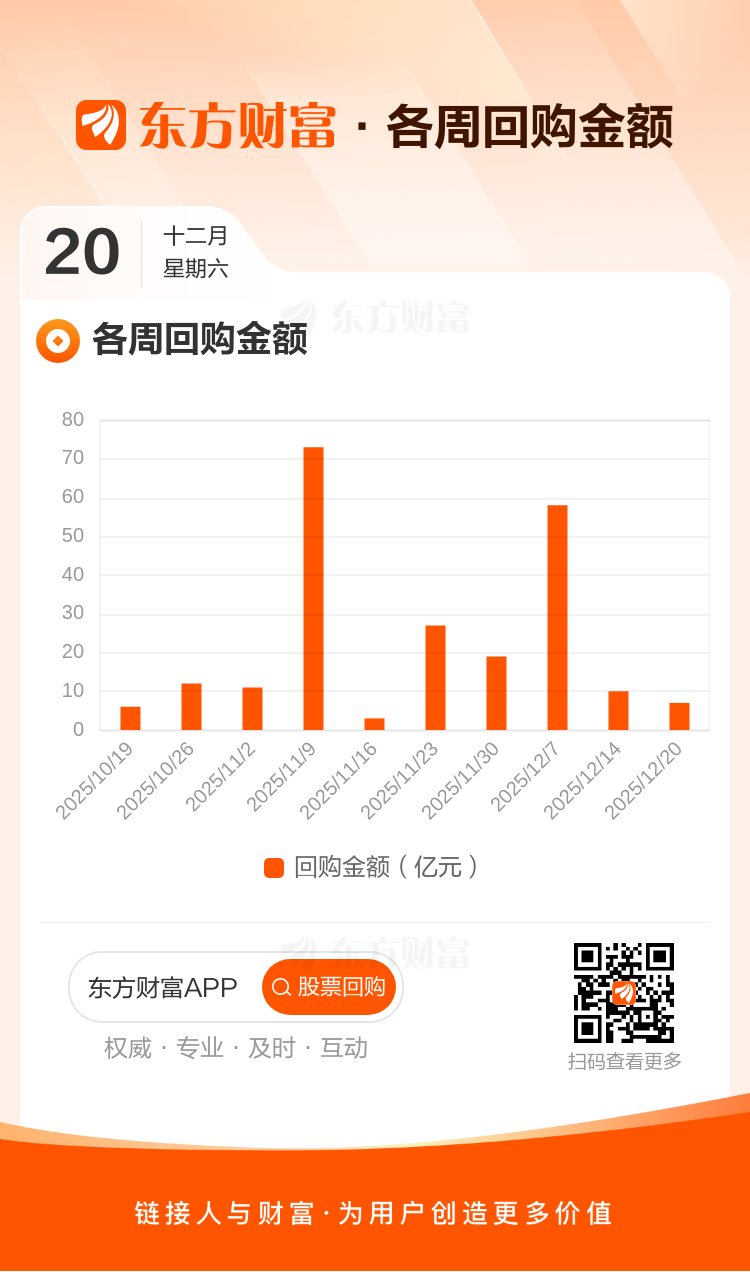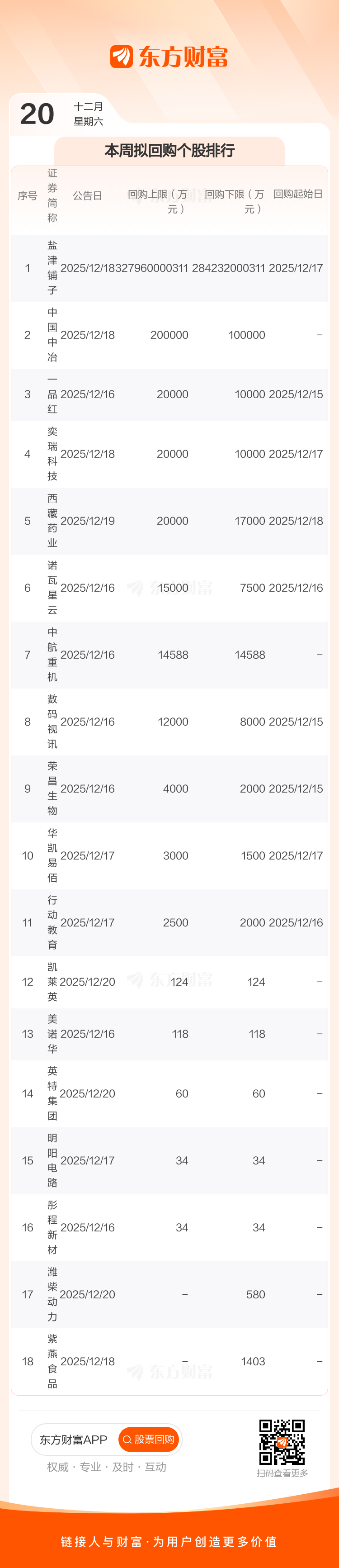 本周有18家公司宣布回购计划,按拟回购金额上限统计,计划回购金额3279.60万亿元。其中盐津铺子拟回购金额上限最高,为3279.60万亿元。