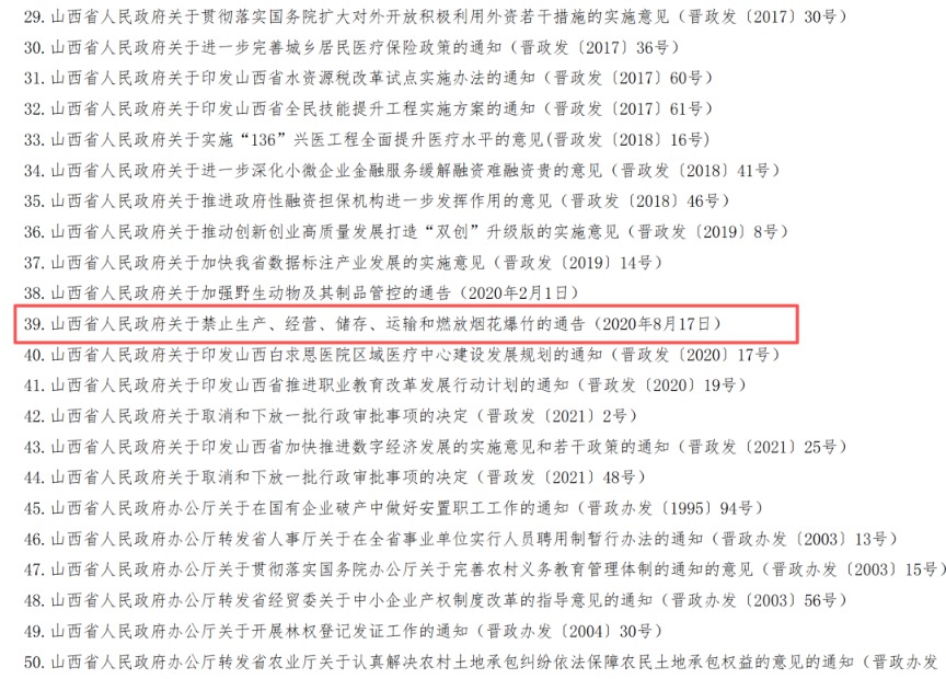 此前发布的《山西省人民政府关于禁止生产、经营、储存、运输和燃放烟花爆竹的通告》