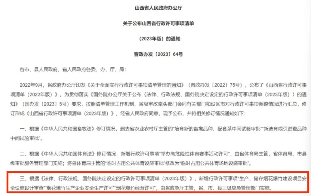 据山西当地媒体此前报道,山西省在烟花爆竹管理政策上此前已进行过调整,根据2023年11月9日发布的《山西省人民政府办公厅关于公布山西省行政许可事项清单(2023年版)的通知》,山西省新增了一系列与烟花爆竹相关的行政许可事项,新增的行政许可事项包括“生产、储存烟花爆竹建设项目安全设施设计审查”“烟花爆竹生产企业安全生产许可”以及“烟花爆竹经营许可”。这些许可事项由省应急厅主管,省、市、县三级应急管理部门负责实施。这一变化旨在强化对烟花爆竹产业的监管,保障生产、储存和经营过程中的安全。该公告意味着山西省对于烟花爆竹政策进行了更加细致和灵活的调整。