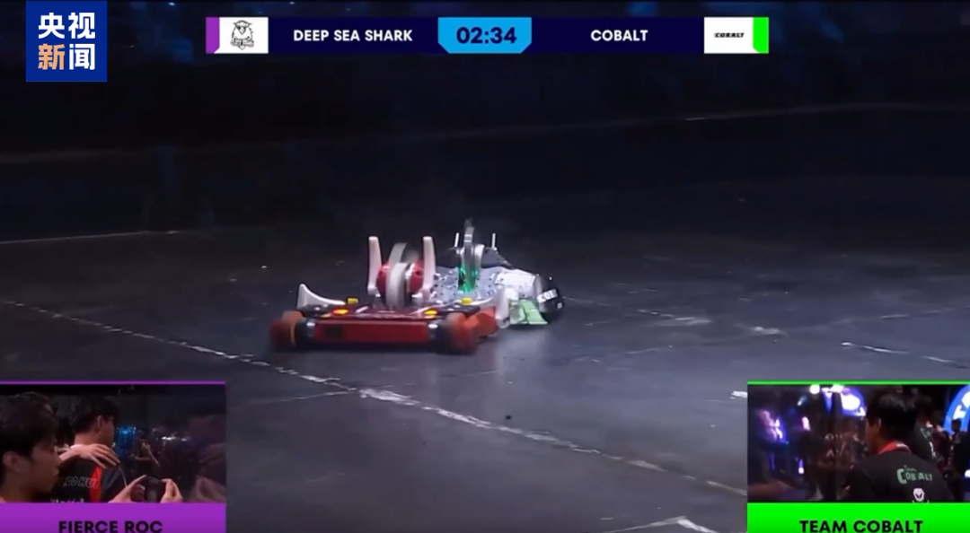 总台记者王政:我身旁就是深海巨鲨3机器人。机器人重110公斤,最高时速28公里。转速高达每分钟1万转。这是机器人进攻的武器,这个红色部分是来防御对方机器人的攻击。