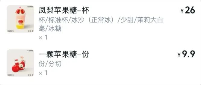 据乐乐茶小程序显示,新品“凤梨苹果糖”单杯价格26元,另外加“一颗苹果糖”是9.9元。