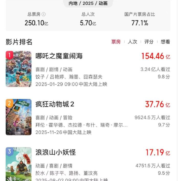 突破250亿元!2025年成中国影史动画电影票房最高一年