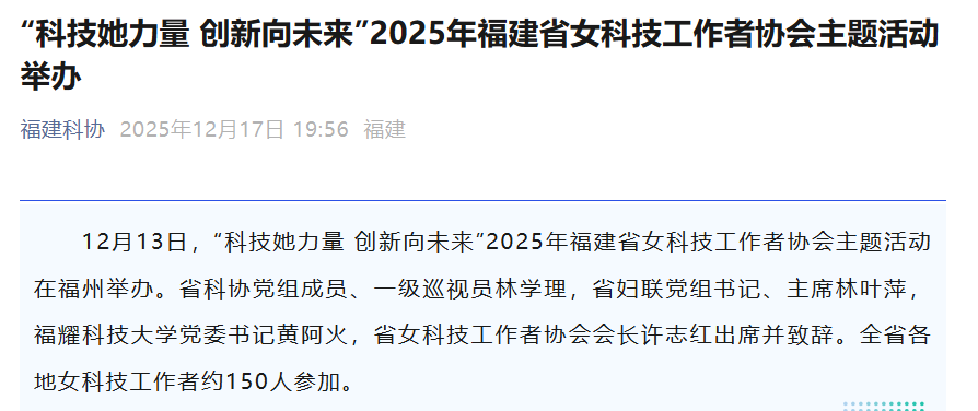 据“福建科协”微信公众号消息,“科技她力量创新向未来”2025年福建省女科技工作者协会主题活动日前在福州举办。省科协党组成员、一级巡视员林学理,省妇联党组书记、主席林叶萍,福耀科技大学党委书记黄阿火,省女科技工作者协会会长许志红出席并致辞。全省各地女科技工作者约150人参加。