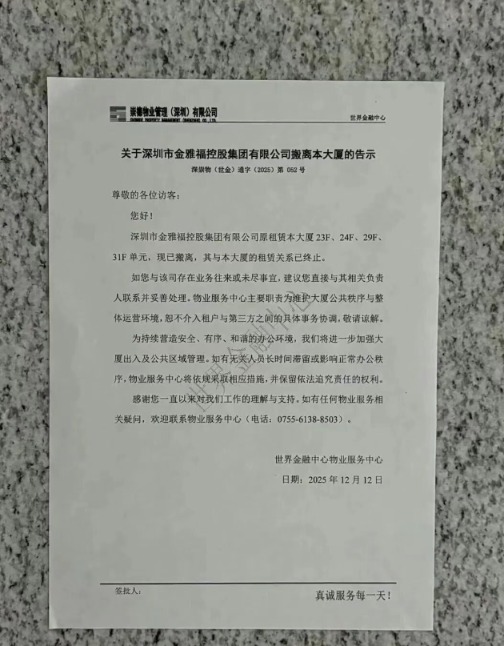 记者看到,相关楼层多处张贴有该大厦物业公司公告,称金雅福原租赁该大厦23F、24F、29F、31F单元,现已搬离,其与该大厦的租赁关系已终止。公告签发日期为2025年12月12日。