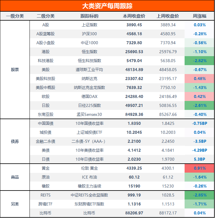 本周,A股震荡分化。上证指数微涨0.03%,沪深300下跌0.28%,中证1000下跌0.56%;港股方面,恒生指数下跌1.1%,恒生科技指数下跌2.82%。