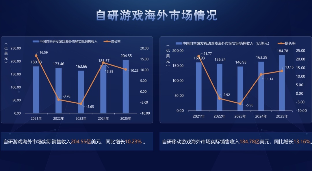 数据显示,2025年,自主研发游戏国内市场实际销售收入2910.95亿元,同比增长11.64%,除得益于头部长青产品稳定支撑外,多款自研新品也带来明显增量。其中,自研游戏海外市场实际销售收入204.55亿美元,同比增长10.23%,规模已连续六年超千亿元人民币。
