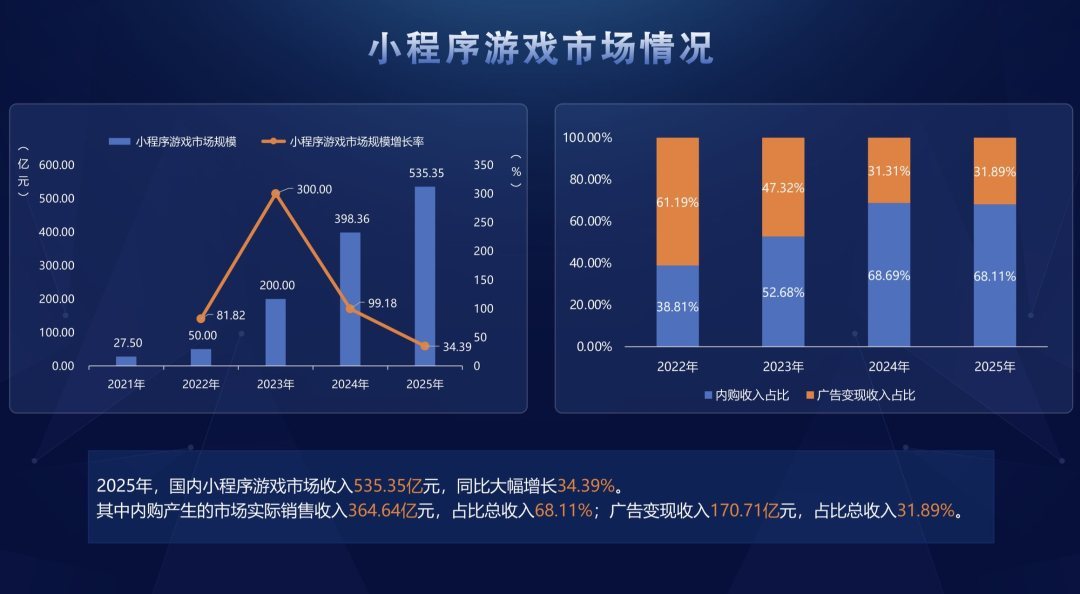 报告显示,2025年,国内小程序游戏市场收入535.35亿元,同比大幅增长34.39%。其中,内购产生的市场实销收入364.64亿元,占比总收入68.11%;广告变现收入170.71亿元,占比总收入31.89%。