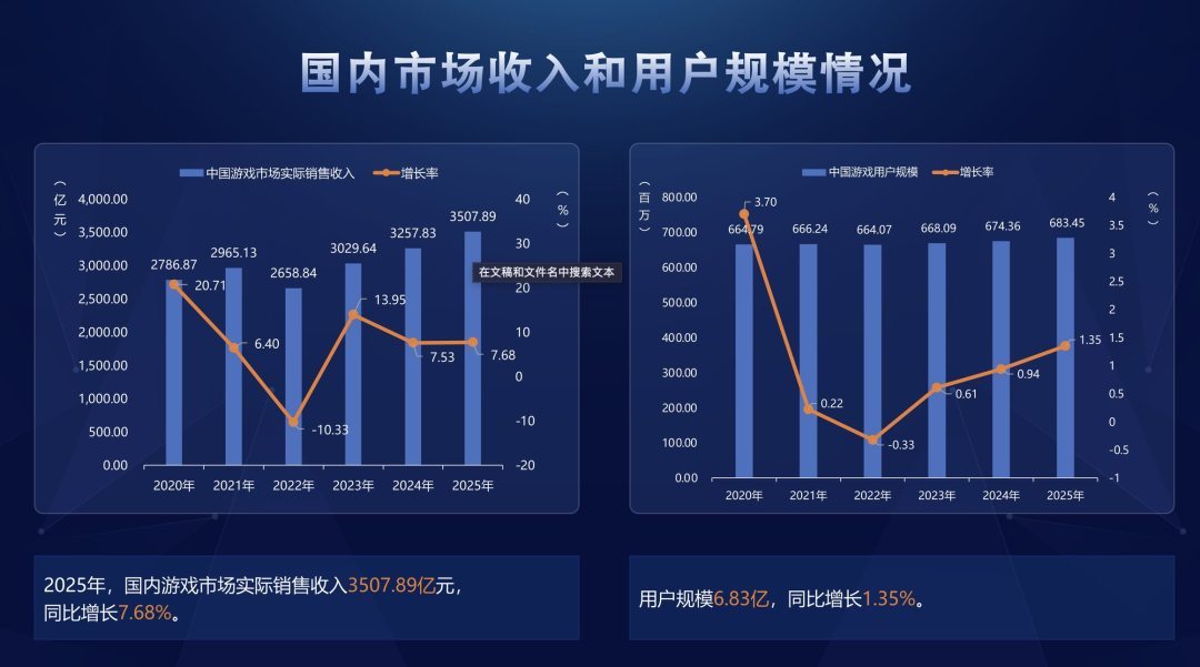 报告显示,2025年,国内游戏市场实际销售收入3507.89亿元,同比增长7.68%;用户规模6.83亿,同比增长1.35%。同为历史新高点。