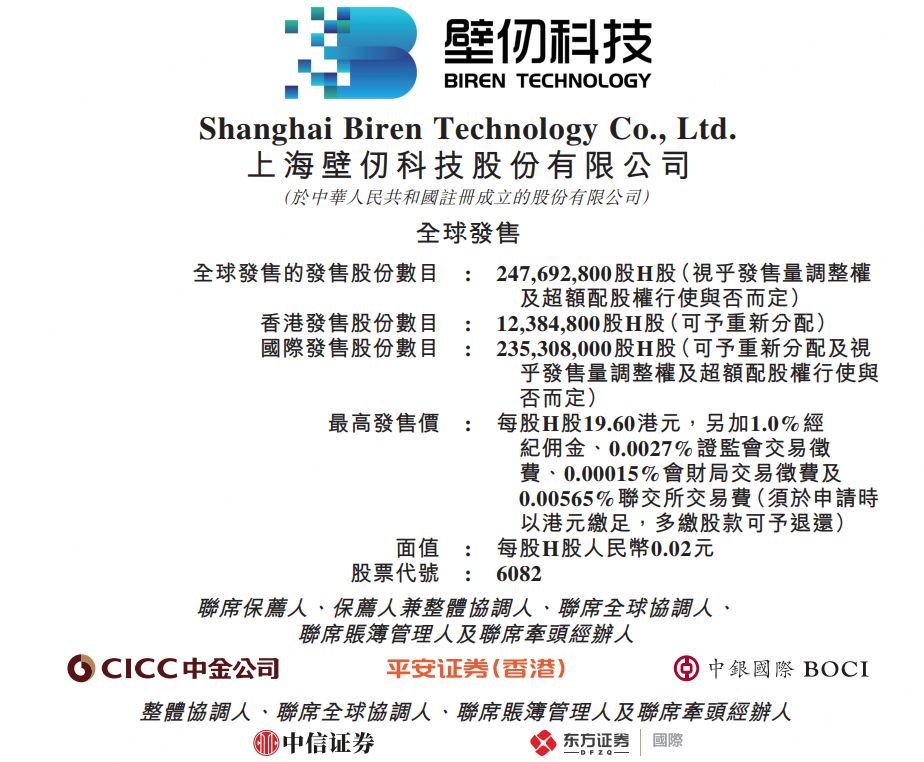 12月22日,壁仞科技于12月22日-2025年12月29日招股,拟全球发售2.48亿股H股,香港公开发售占约5%,国际发售占约95%,另有约15%超额配股权。发售价为每股发售股份17.00-19.60港元,每手200股,预期H股将于1月2日开始在联交所买卖。