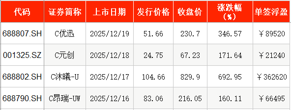 12月19日,优讯股份在上交所挂牌上市,发行价为51.66元/股,截至上市首日收盘,该股报230.7元/股,涨幅为346.57%。以收盘价计算,投资者中一签浮盈为8.95万元。