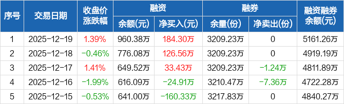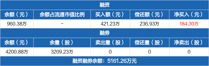 融资方面,当日融资买入421.23万元,融资偿还236.93万元,融资净买入184.3万元,连续3日净买入累计344.28万元。融券方面,融券卖出0份,融券偿还0份,融券余量3209.23万份,融券余额4200.88万元。融资融券余额合计5161.26万元。