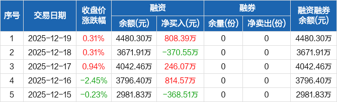 融资方面,当日融资买入1466.85万元,融资偿还658.46万元,融资净买入808.39万元。融券方面,融券卖出0份,融券偿还0份,融券余量0份,融券余额0元。融资融券余额合计4480.3万元。