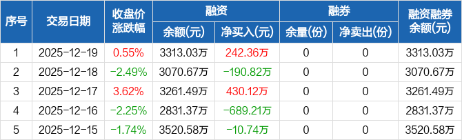 融资方面,当日融资买入541万元,融资偿还298.64万元,融资净买入242.36万元。融券方面,融券卖出0份,融券偿还0份,融券余量0份,融券余额0元。融资融券余额合计3313.03万元。