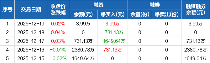 融资方面,当日融资买入3.99万元,融资偿还0元,融资净买入3.99万元。融券方面,融券卖出0份,融券偿还0份,融券余量0份,融券余额0元。融资融券余额合计3.99万元。