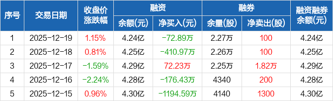 融资方面,当日融资买入583.49万元,融资偿还656.38万元,融资净偿还72.89万元。融券方面,融券卖出200股,融券偿还100股,融券余量2.27万股,融券余额25.9万元。融资融券余额合计4.24亿元。