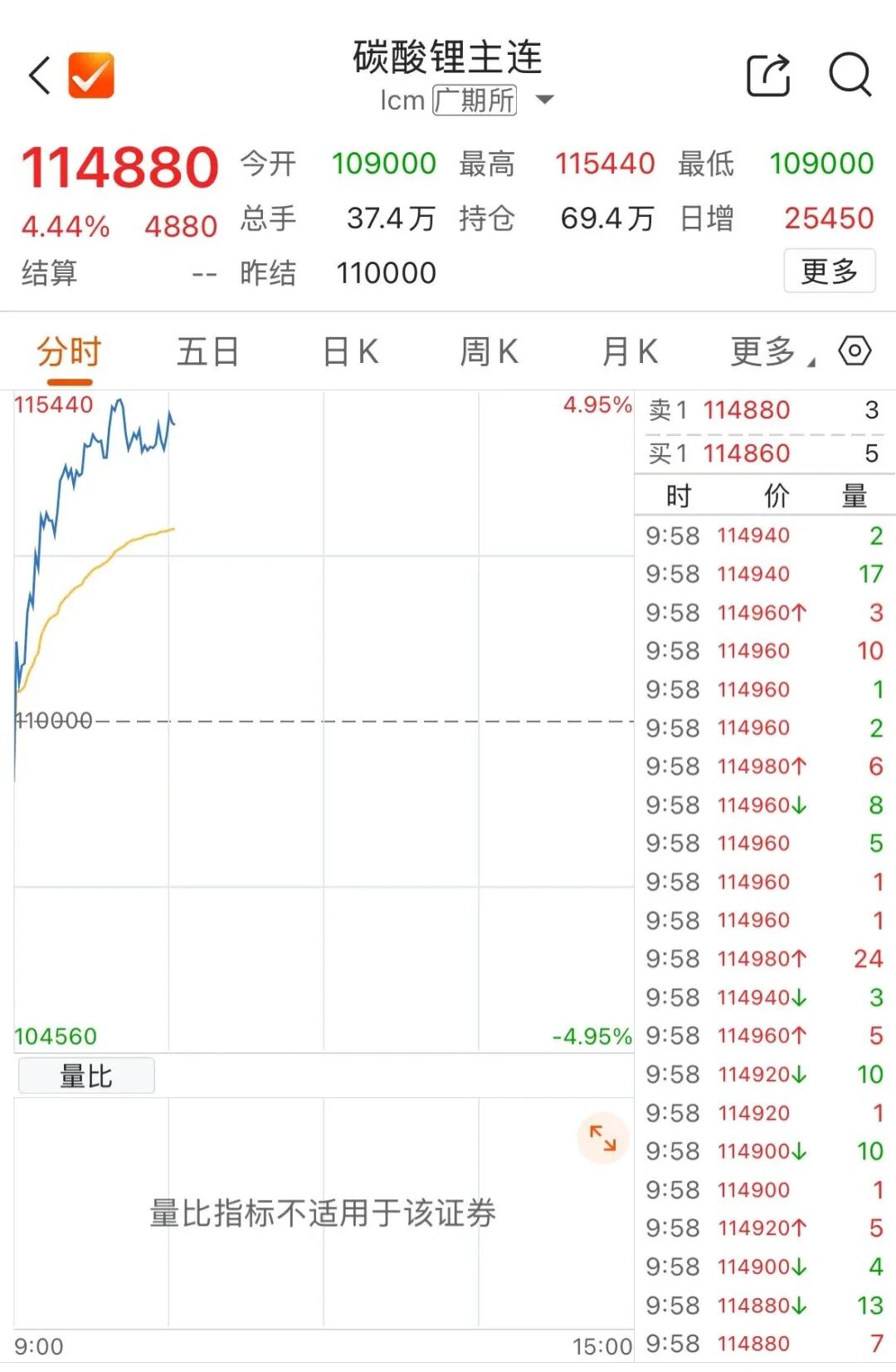 此外,广期所碳酸锂主力合约走高,盘中一度涨近5%,截至发稿涨4.44%。