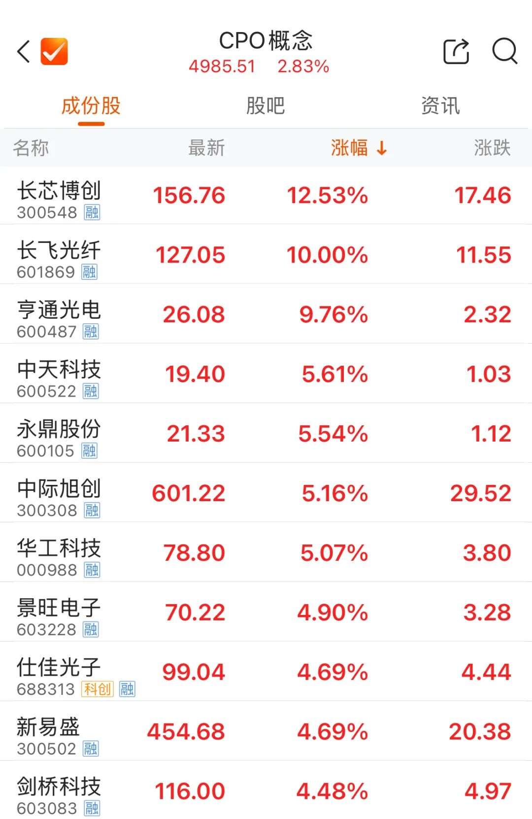 CPO概念表现活跃,长飞光纤、亨通光电涨停,长芯博创涨近13%,中天科技、永鼎股份等跟涨。