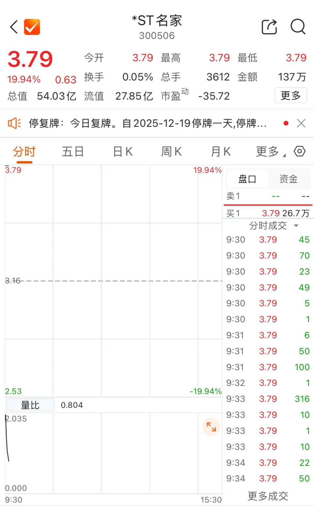 个股方面,重整后的*ST名家(300506)今天复牌,开盘即涨停,报3.79元/股。