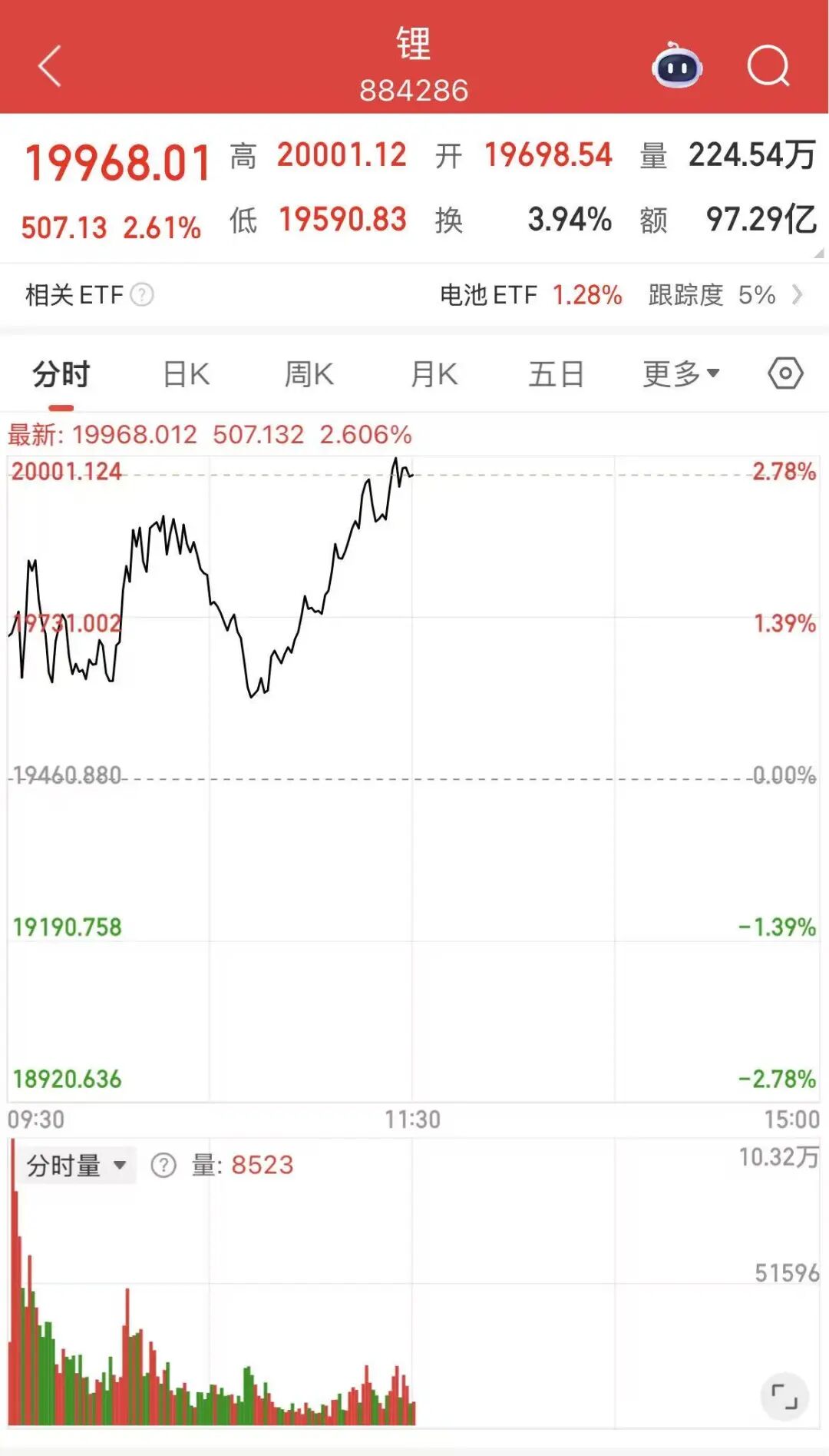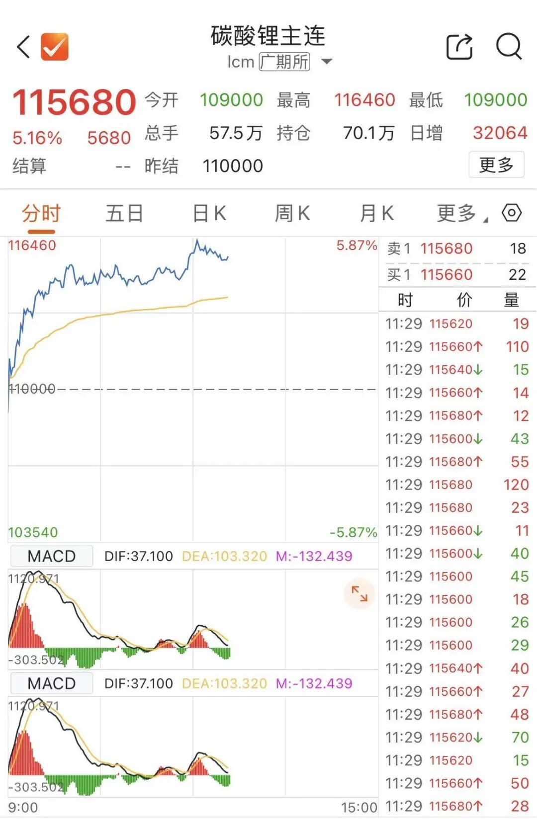 12月22日早盘,碳酸锂主力合约盘中大涨,一度站上116460元/吨的高位,创下该合约年内最高价,截至午间收盘,涨5.16%。同花顺锂板块涨近3%,天齐锂业、盛新锂能、融捷股份涨幅居前。