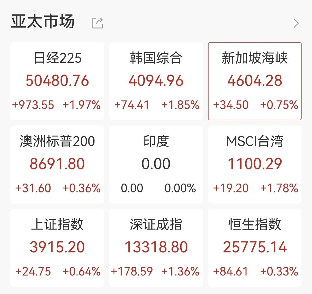 亚太其余主要股市也呈现上涨趋势,截至发稿,日经225涨近2%,软银涨超5%,韩国综合指涨1.85%,三星电子涨近4%。