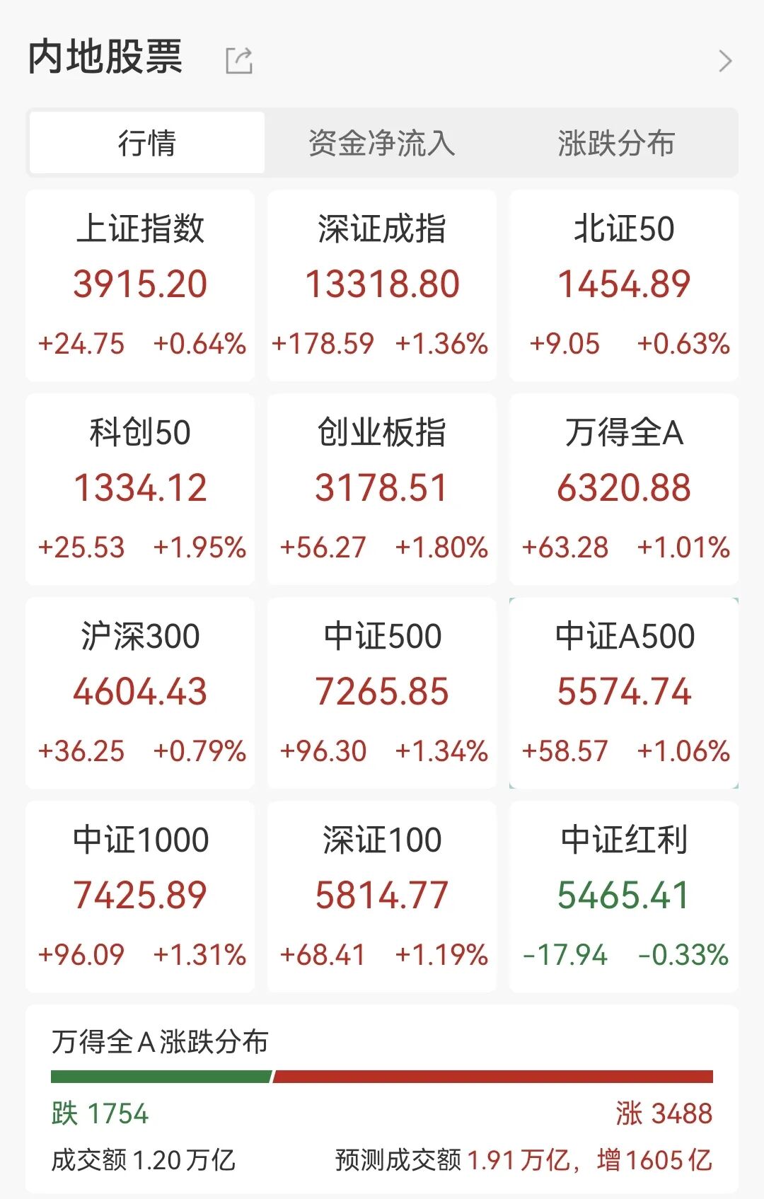 12月22日,A股三大指数集体走强,截至午盘,涨幅持续扩大。沪指涨0.64%收复3900点关口,深成指涨1.36%,创业板指涨1.8%。沪深两市半日成交额1.2万亿。盘面上热点快速轮动,全市场近3500只个股上涨。