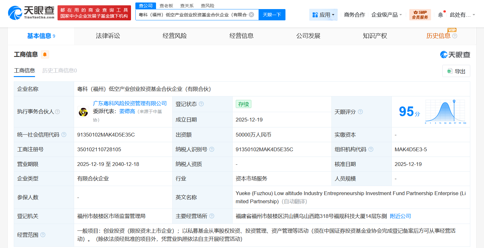 天眼查App显示,近日,粤科(福州)低空产业创业投资基金合伙企业(有限合伙)成立,执行事务合伙人为广东粤科风险投资管理有限公司,出资额5亿人民币,经营范围为创业投资,以私募基金从事股权投资、投资管理、资产管理等活动。合伙人信息显示,该基金由福州国资集团旗下福州榕投产业发展投资基金合伙企业(有限合伙)、广东省新兴产业投资基金合伙企业(有限合伙)、福州市规划设计研究院集团有限公司等共同出资。