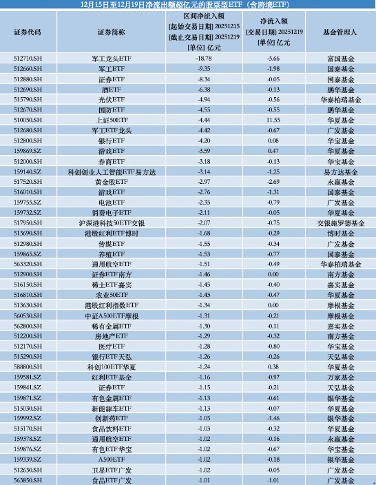除军工外,证券、白酒、银行等相关ETF板块同样呈现资金净流出态势,相关产品单周净流出规模均超过4亿元。