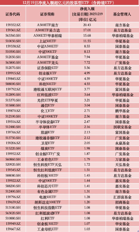 具体产品方面,12月19日净流入额前三的均为A500ETF:南方中证A500ETF、易方达中证A500ETF、华泰柏瑞中证A500ETF分别获净流入20.43亿元、17.01亿元和15.68亿元。紧随其后的华夏上证50ETF、国泰中证A500ETF、南方中证A500ETF、华夏中证A500ETF、广发中证A500ETF单日净流入均超过5亿元。