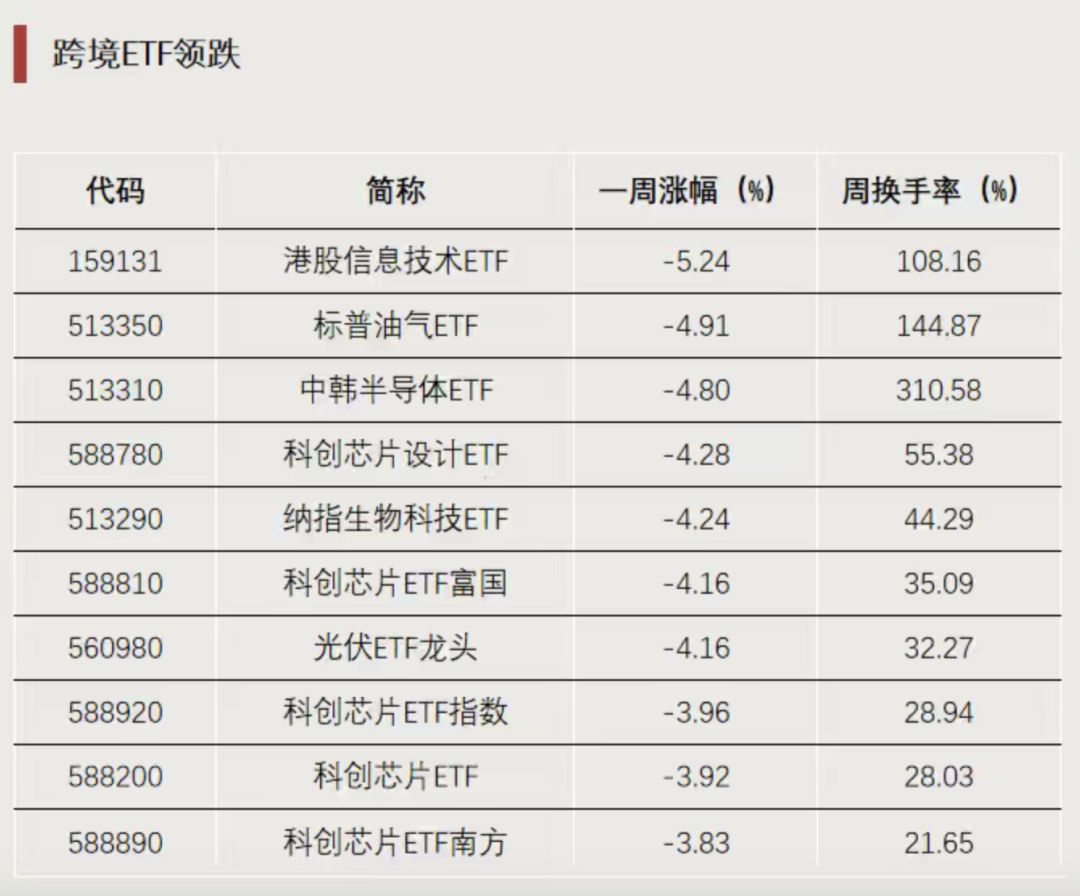 跨境ETF领跌,港股信息技术ETF、标普油气ETF、中韩半导体ETF、纳指生物科技ETF等跨境ETF跌幅居前。投资A股的ETF中,科创芯片相关ETF跌幅较大,科创芯片设计ETF、科创芯片ETF富国跌超4%,科创芯片ETF指数、科创芯片ETF等跌超3%。