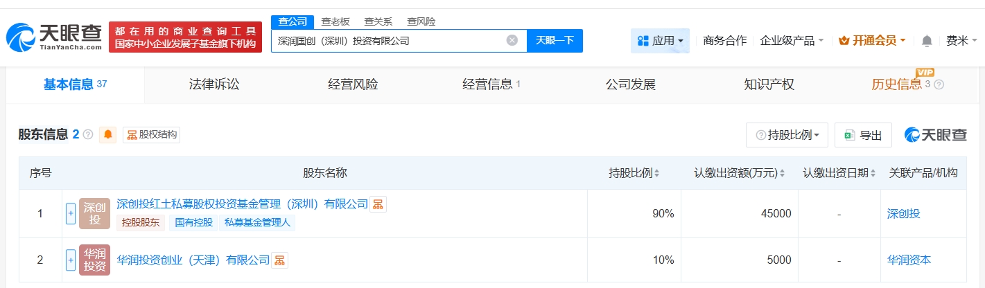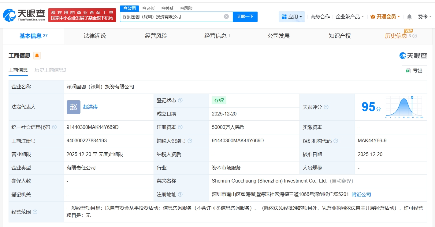 每经AI快讯,天眼查App显示,近日,深润国创(深圳)投资有限公司成立,法定代表人为赵洪涛,注册资本5亿元人民币,经营范围为以自有资金从事投资活动、信息咨询服务,由深创投红土私募股权投资基金管理(深圳)有限公司、华润投资创业(天津)有限公司共同持股。