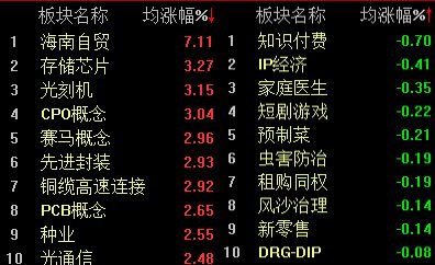 板块方面,海南自贸概念、贵金属、光通信模块、能源金属、半导体、CPO等板块涨幅居前。而医药商业、教育、商业百货、保险等板块领跌。