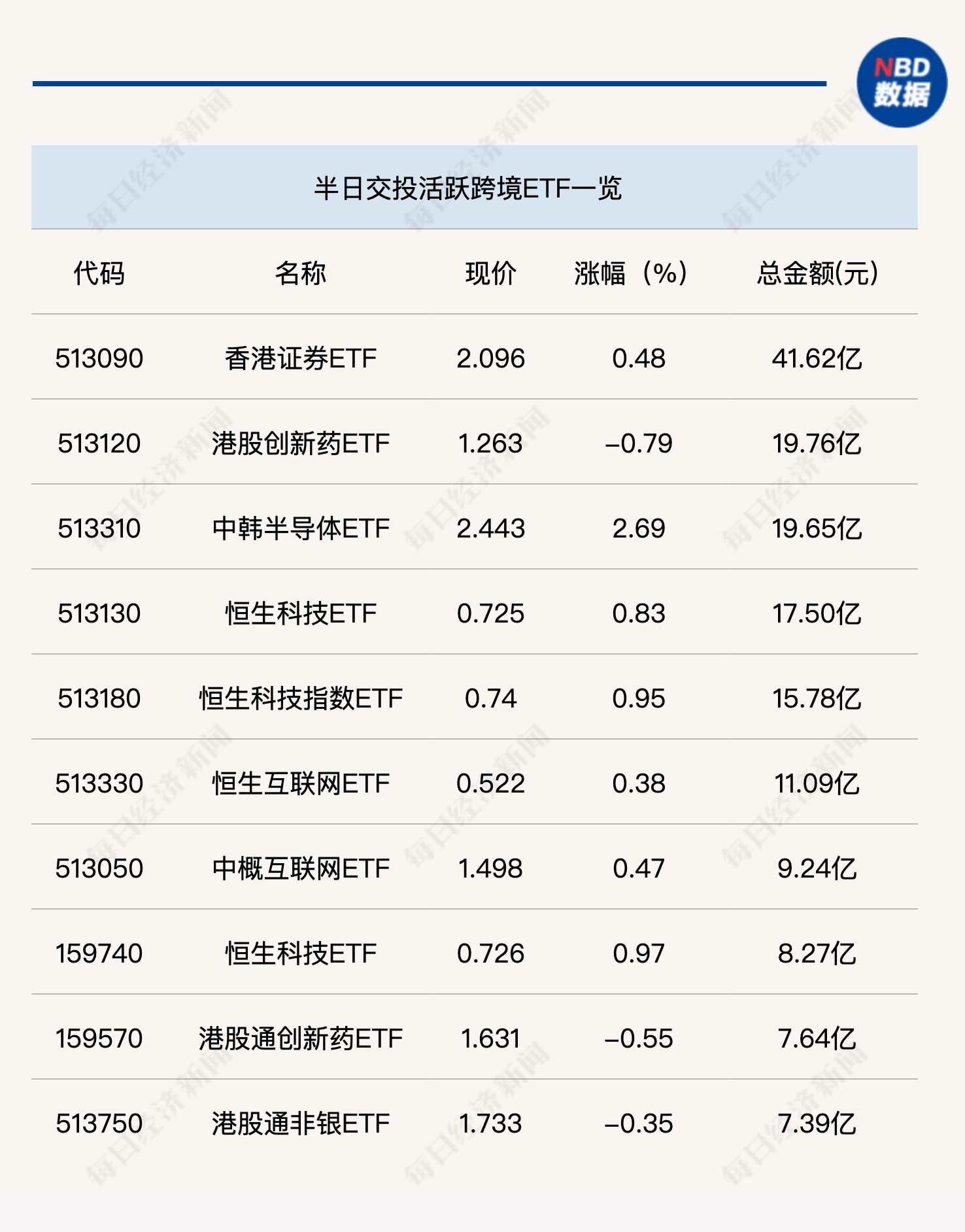 今日上午,科创芯片ETF(588200)交投相对活跃,半日成交金额近20亿元;通信ETF(515880)显著放量,半日成交金额达到10.77亿元。跨境ETF方面,香港证券ETF(513090)半日成交金额为41.62亿元,成交金额相对较大。