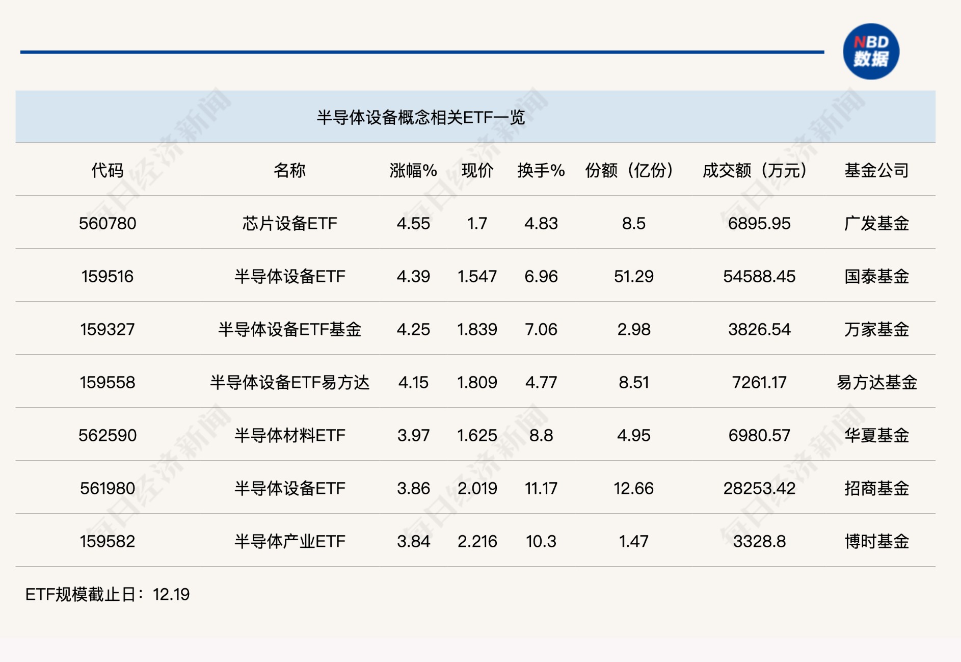 点评:芯片设备ETF(560780)今日上午涨幅达4.55%,份额为8.5亿份,成交金额达6895.95万元,其追踪的是中证半导体材料设备主题指数。追踪该指数的ETF还包括半导体设备ETF(159516)、半导体设备ETF基金(159327)等。其中,半导体设备ETF(159516)规模较大,份额为51.29亿份,该ETF半日上涨4.39%,半日成交金额达到5.46亿元。