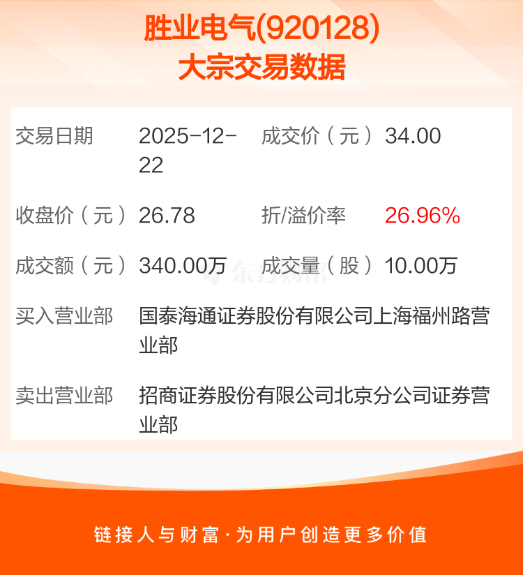 大宗交易:胜业电气成交340.00万元,溢价26.96%(12-22)